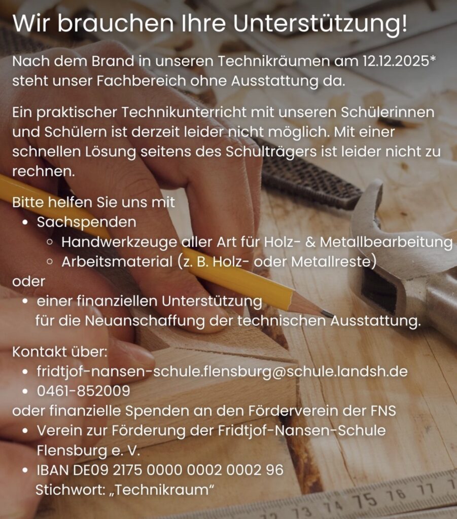 Spendenmöglichkeit über den Förderverein: Verein zur Förderung der Fridtjof-Nansen-Schule Flensburg e.V., Stichwort „Technikraum“, IBAN: DE09217500000002000296