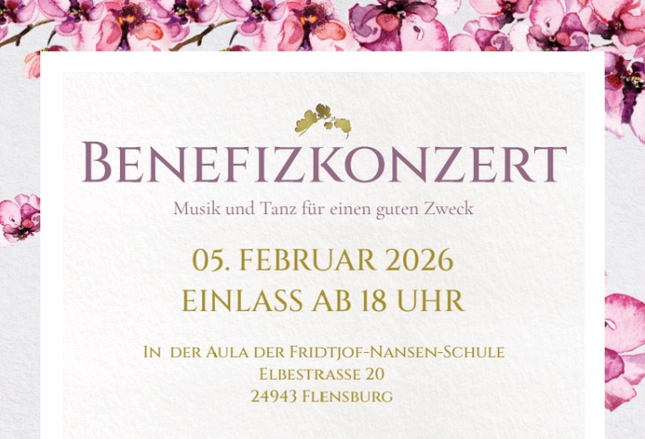 Am Donnerstag, 5. Februar 2026, findet in der Aula der Fridtjof-Nansen-Schule ein Benefizkonzert für ein Flensburger Frauenhaus statt. Auf dem Programm stehen Auftritte der Ballettschule Flensburg, Live-Band, Gesang und Klavier. Der Eintritt ist frei. Es werden Spenden erbeten, die zugunsten…